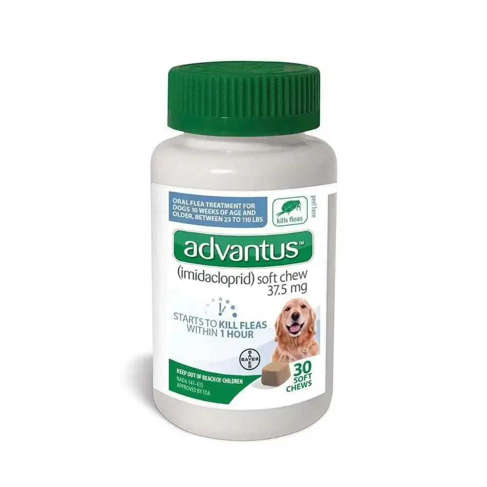 Advantus (imidacloprid) soft chews are a fast-acting treatment of flea infestations on dogs and puppies 10 weeks of age and older weighing 4 pounds or greater. These flavored chews start killing fleas within 1 hour with just a single dose. In the event of a continued infestation, you can safely repeat the treatment as often as once per day fda approved soft chew starts for large dogs & small dogs